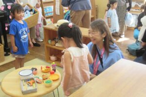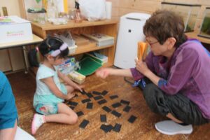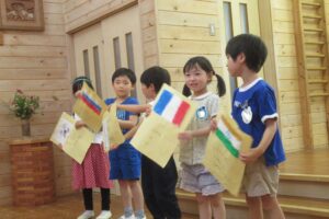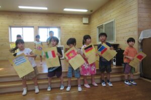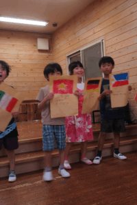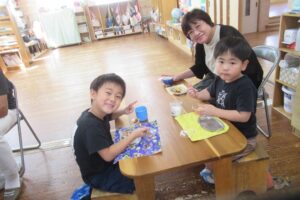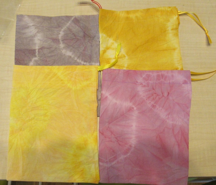 年長児が時間をかけて取り組んだ絞り染めの袋です。