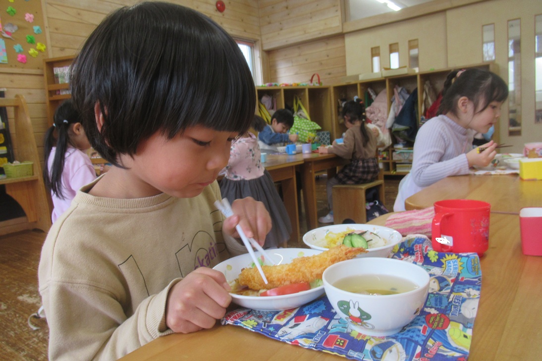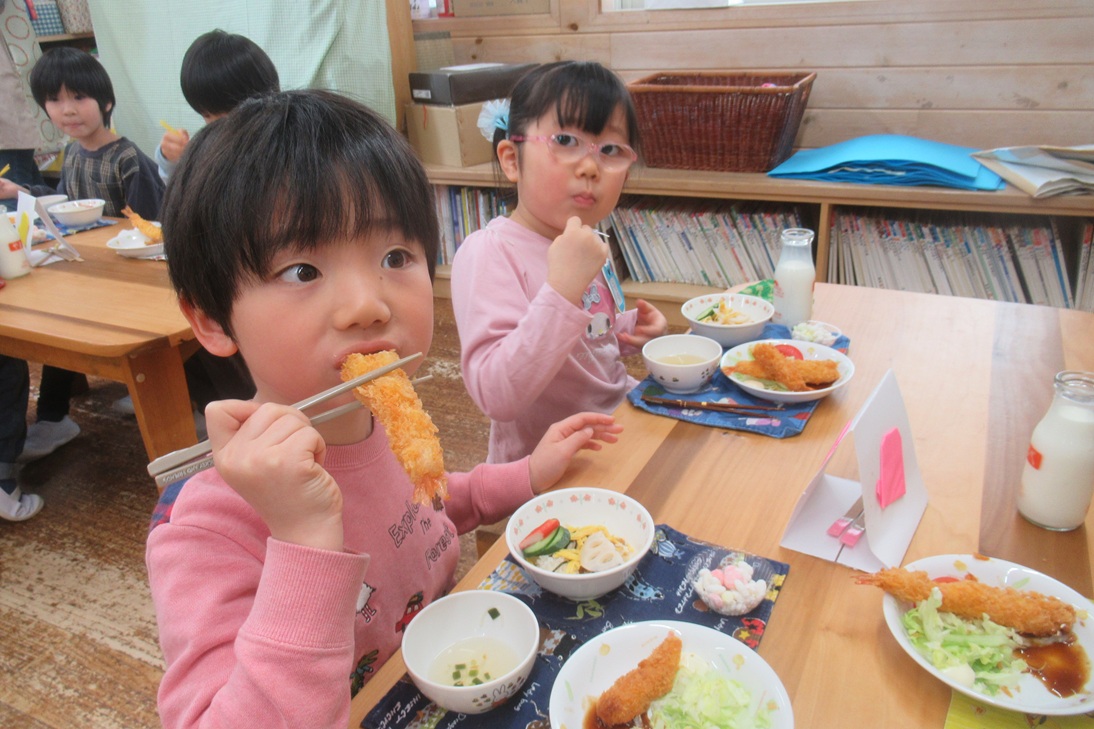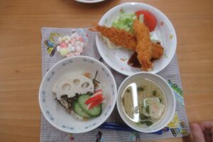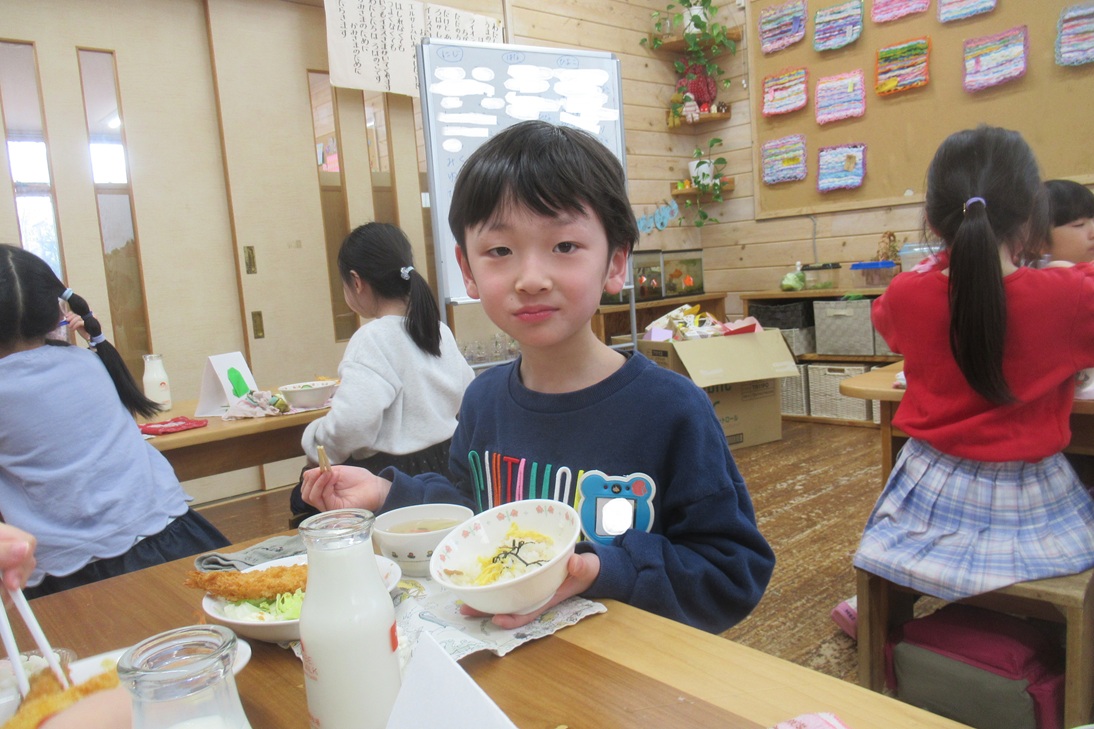 今日の給食 🌸ひなまつりメニュー🌸 散らし寿司 大きなエビフライ!! 嬉しい春の訪れですね